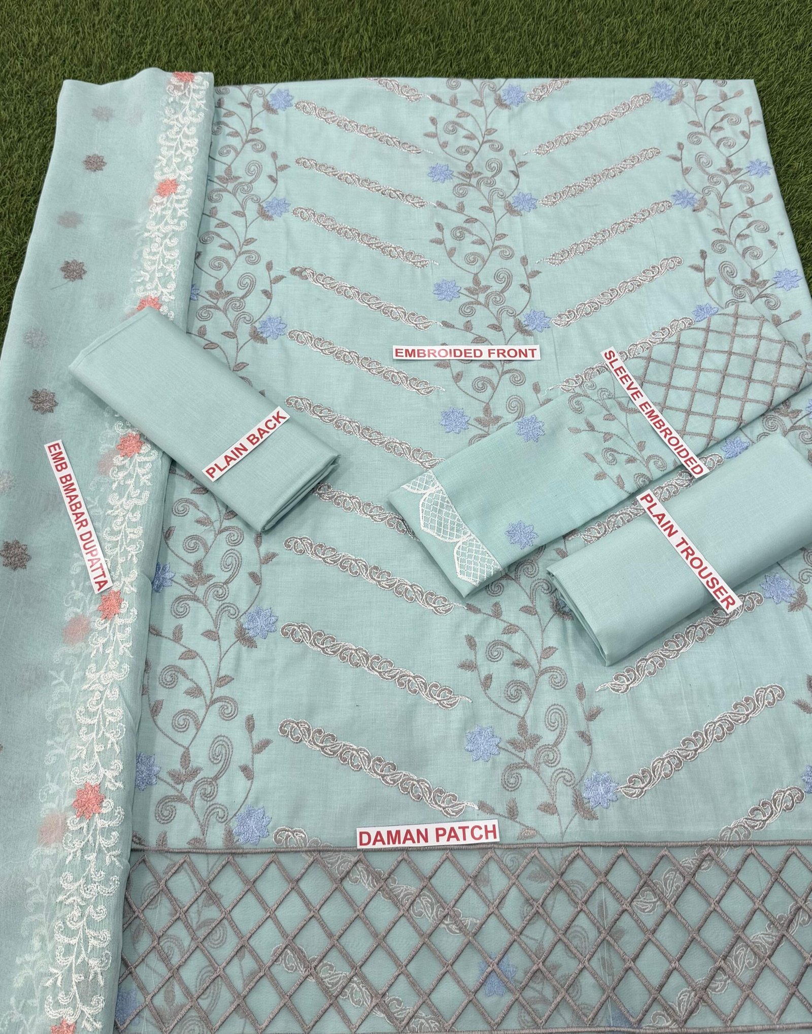 The AZURE 3PC Premium Lawn Collection uses Lawn 90/70 fabric, making it breathable and ideal for Pakistan’s weather ☀️. The embroidered daman patch enhances the outfit, and the bamber embroidered dupatta completes the luxury feel. Whether you are heading to work, a family gathering, or a casual event, this suit solves the problem of looking stylish without compromising comfort. A reliable choice for women who value quality and timeless fashion.