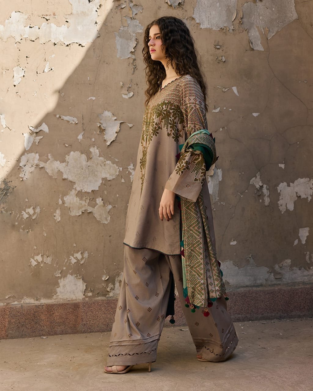 Hoor Khaddar 3PC winter premium khaddar dress with digital printed shirt, plazoo trouser, and Monar dupatta