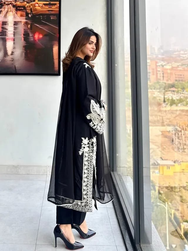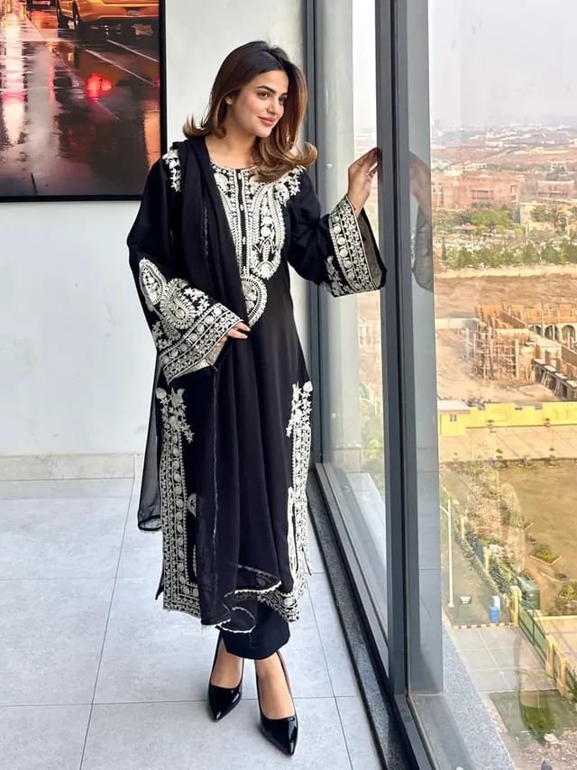 The long embroidered shirt gives a graceful silhouette, while detailed embroidery on the sleeves and shirt front adds sophistication. Paired with an embroidered trouser and a lightweight shafon lace dupatta, this outfit completes a stylish and balanced look.